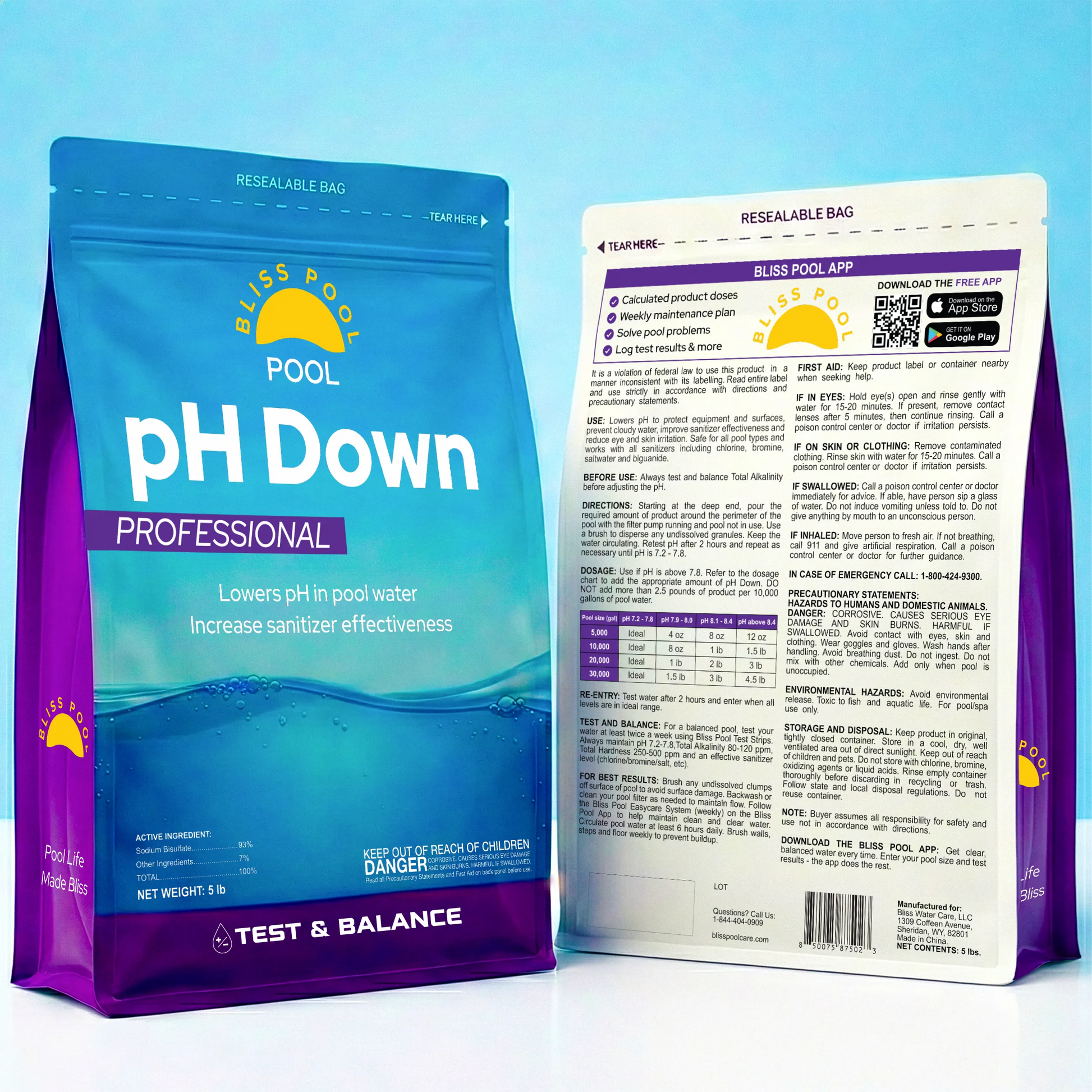 Bliss Pool pH Down is a fast dissolving pH decreaser that lowers high pH to protect pool equipment & surfaces, boost sanitizer performance and help prevent eye or skin irritation. Safe for all pool types and compatible with chlorine, bromine, saltwater and biguanide systems. Use when pH is above 7.8. Test pH twice a week with Bliss Pool Test Strips and get personalized product and dosage recommendations to maintain the ideal 7.2–7.8 range. Convenient 5 lb resealable bag for easy, reliable pH balancing.